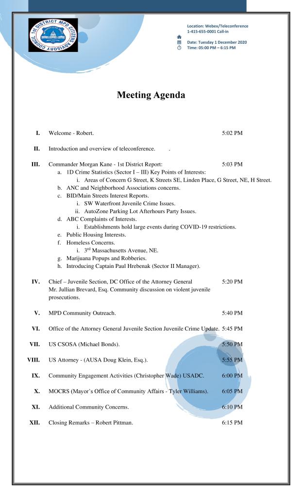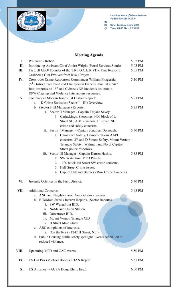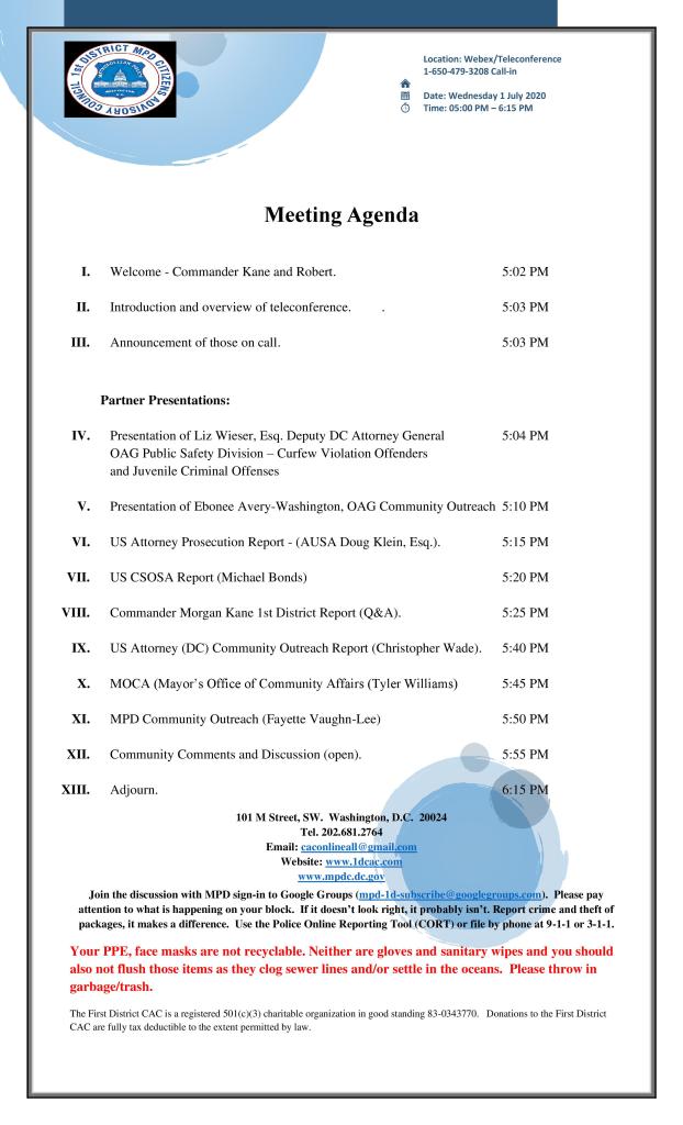 - At approximately 12:24 a.m., First District officers encountered two juveniles in violation of the citywide curfew, which had taken effect at 11:00 p.m., in the 1100 block of New Jersey Avenue, Southeast.