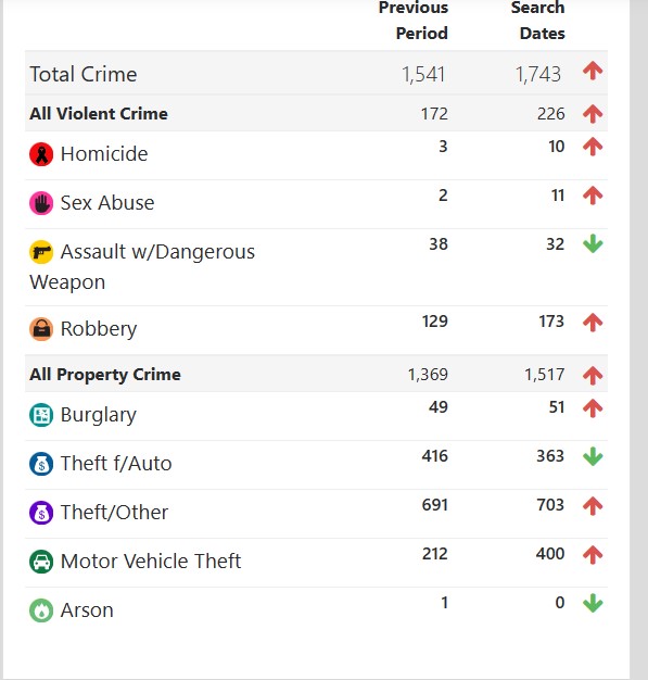 - 136 (13%): Other (ADW, disorderly, riot misdemeanor, narcotics, traffic, release violations, arson, lewd, indecent, or obscene acts)