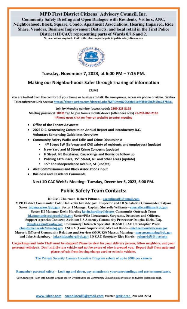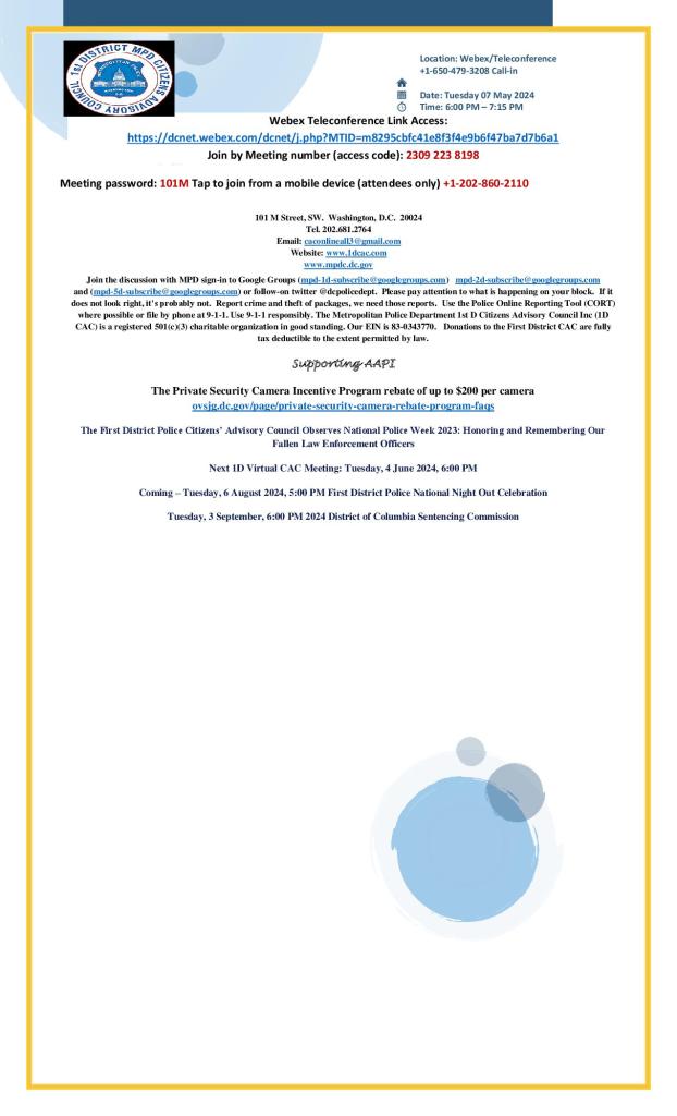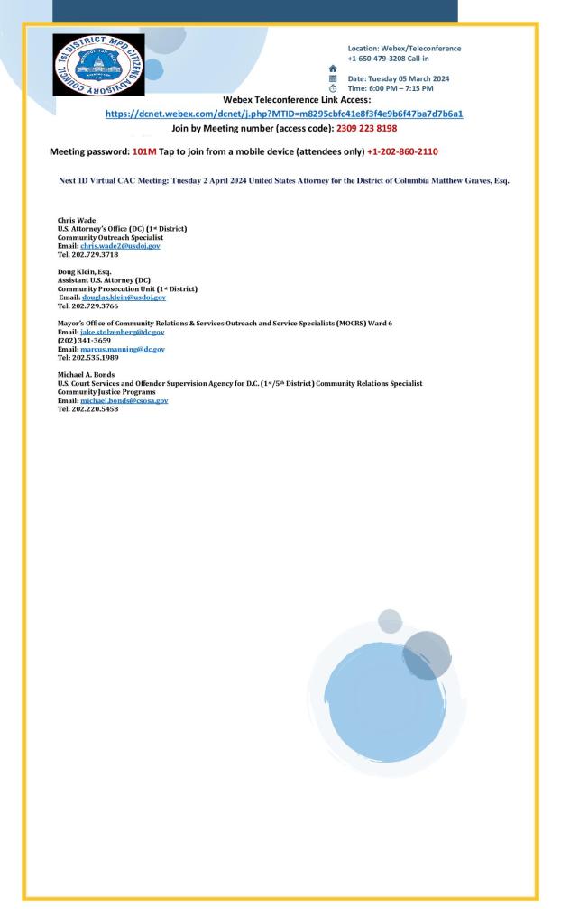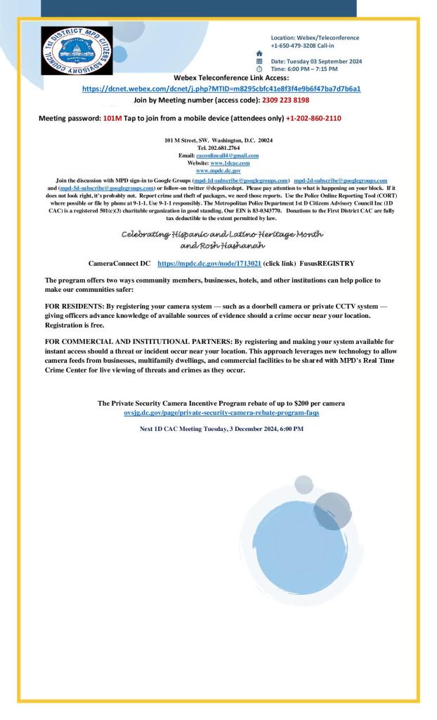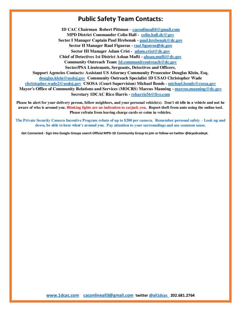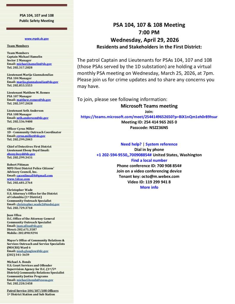 We are currently investigating a string of burglary reports in PSAs 104, 107, and 108. The suspect is described as an African American male, 20-30s, dark complexion, last seen wearing bright colored running shoes (yellow and/or orange), black long length shirt (Under Armor style), dark colored pants with a possible neon stripe. The suspect reportedly is targeting rear doors of private homes, kicking the doors to gain entry and stealing small property items of value (wallets, cell phones, jewelry, electronics etc.). The suspect may be committing these offenses between late evening and early morning hours. Please be certain to properly secure all doors and windows and report suspicious activities immediately by dialing 911. If a suspicious person is observed, please do not confront the subject but discretely call police immediately and provide your call back information if possible. Please provide a detailed description and last known direction of travel for responding officers. If possible, maintain sight of the subject from a safe distance while remaining on the telephone with the police dispatcher. At this time, there has been no personal injuries reported in these cases as the suspect appears to be targeting small property items of value only. Please pass this information along to your neighbors and contact our Command Information Center at 202-727-9099 or the First District Detectives Office on 202-299-2025 with any information you may have relative to these recent events.