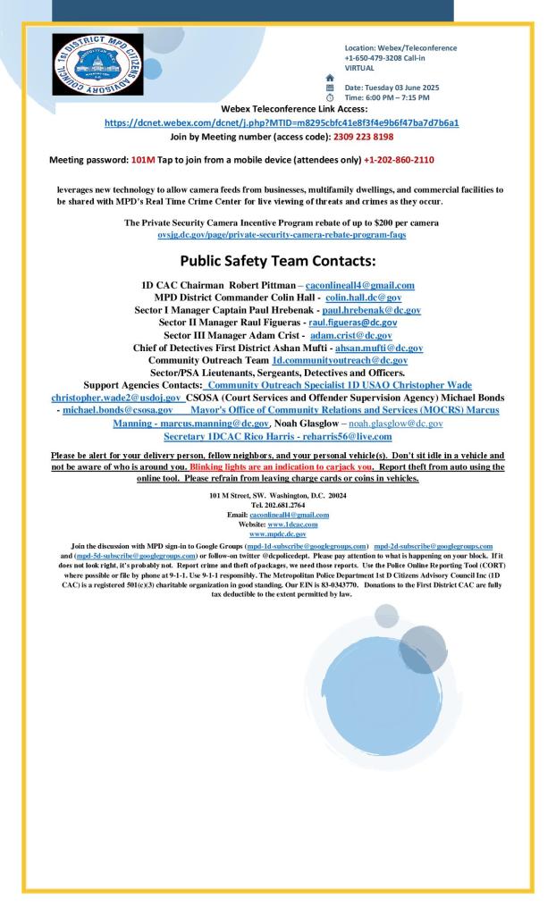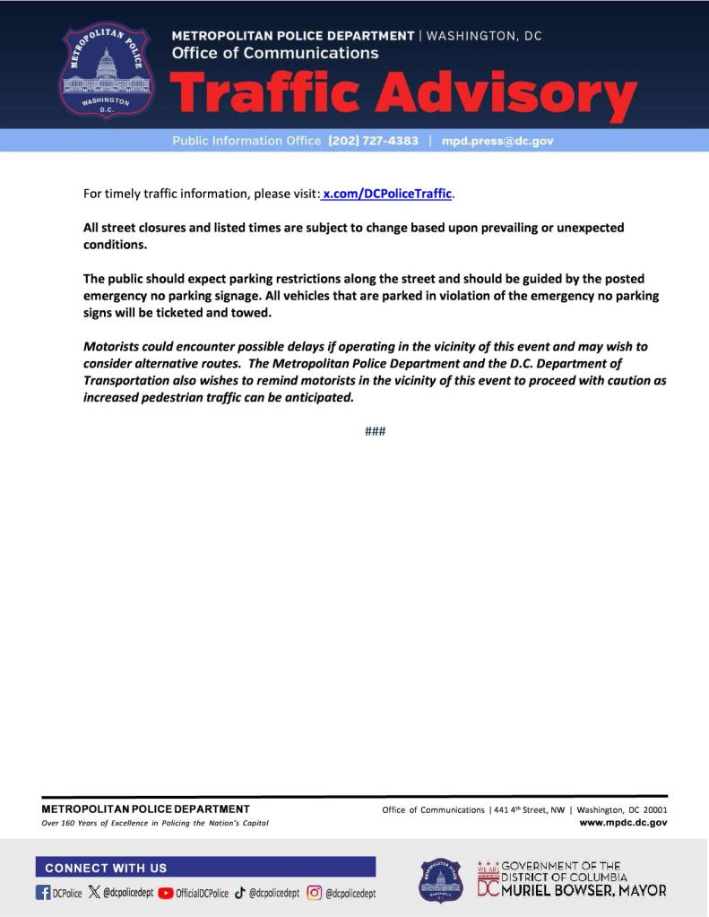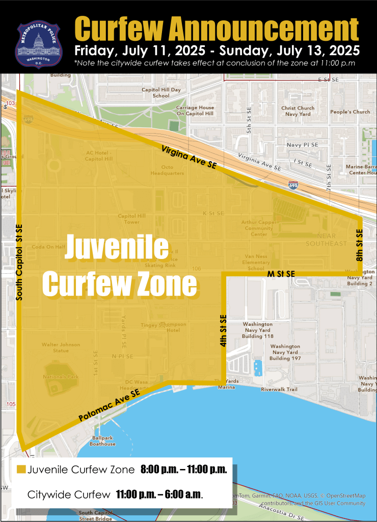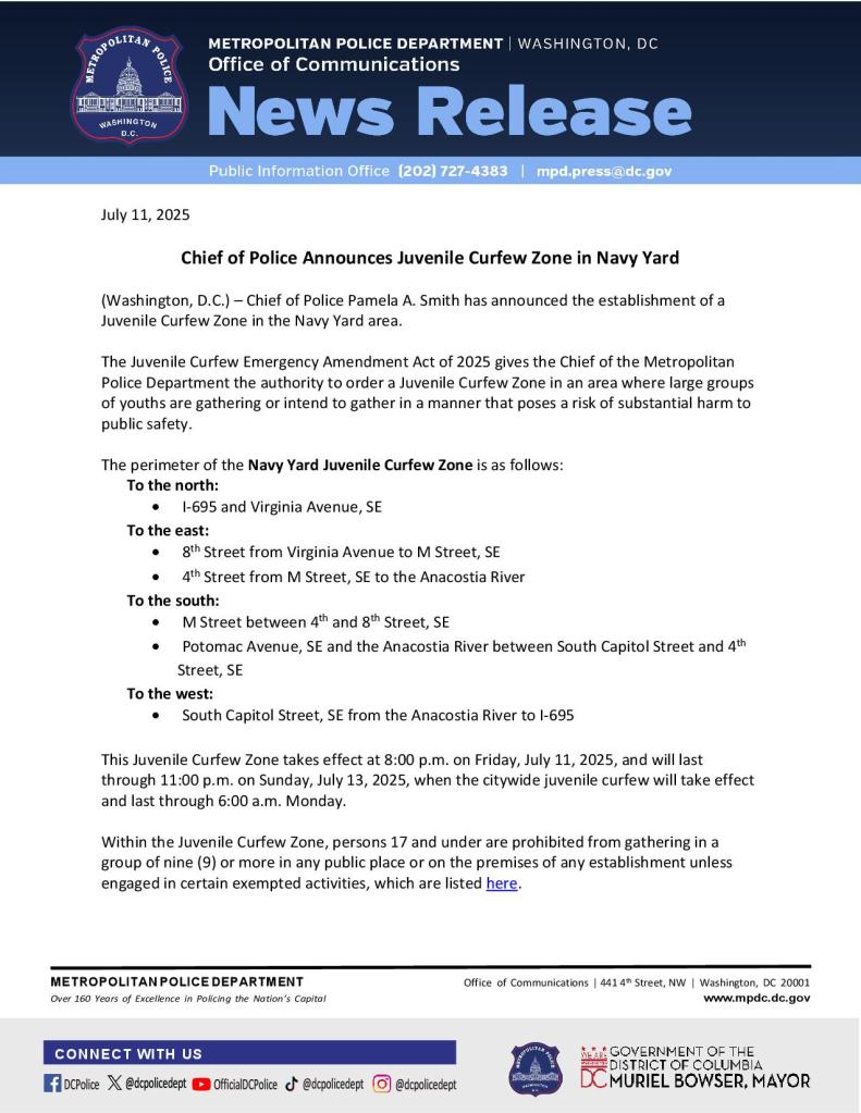 Pursuant to Mayor’s Order 2025-115, Chief of Police Pamela A. Smith declared four Special Juvenile Curfew Zones Saturday evening, in Navy Yard, the U Street Corridor, around Union Station, and around the Banneker Recreation Center.