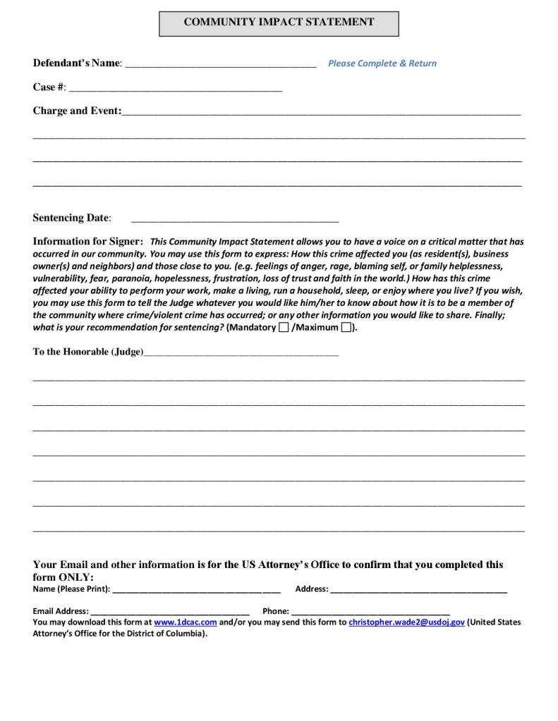 This Community Impact Statement allows you to have a voice on a critical matter that has occurred in our community. You may use this form to express: How this crime affected you (as resident(s), business owner(s) and neighbors) and those close to you. (e.g. feelings of anger, rage, blaming self, or family helplessness, vulnerability, fear, paranoia, hopelessness, frustration, loss of trust and faith in the world.)