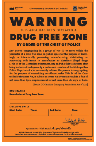 Under Secure DC, a drug free zone is public space, on public property, from which uniformed MPD officers can require groups of two or more people to disperse if they are congregating for illicit drug activity. The law authorizes the Chief of Police to declare any public area encompassing a maximum of 1,000 feet per side a drug free zone for up to five days.